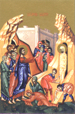 Opste vaskrsenje pre stradanja Svoga potvrdjujuci, iz mrtvih podigao jesi Lazara, Hriste Boze. Stoga i mi, poput dece znamenja pobede noseci, Tebi, Pobeditelju smrti klicemo: Osana na visinama, blagosloven koji dolazi u ime Gospodnje!